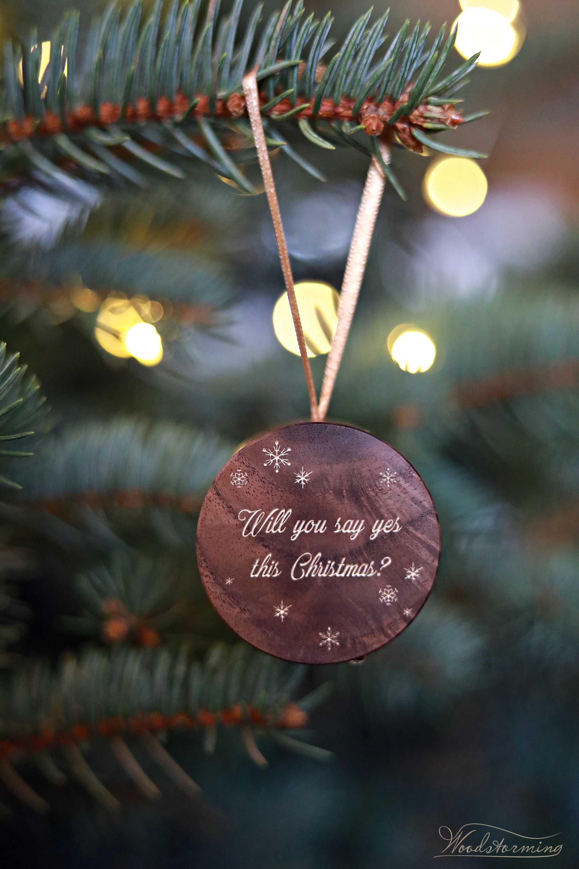 Personalized holiday engagement ring box - round Christmas tree ornament, festive ring box